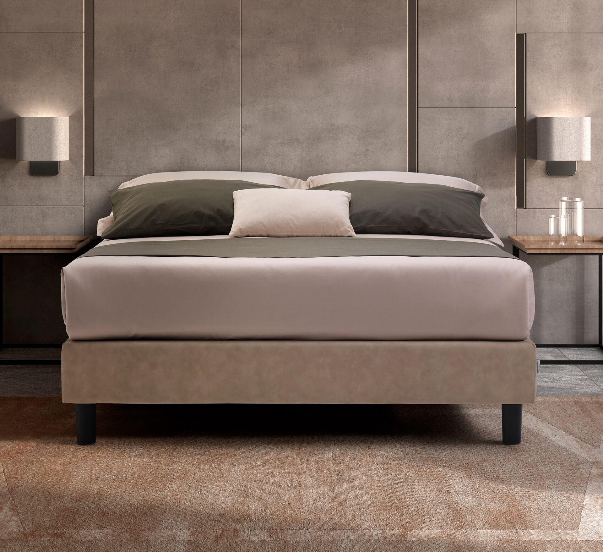 Accessoires standards:Pieds et roulettes en PVC noir de 6/12/15 cm de hauteur, crochet de liaison (pour version simple) et baïonnette, si associé à la tête de lit du lit.